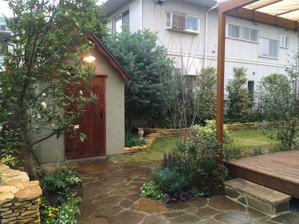 水たまりに悩まされていた庭が大変身!ムーミンみたいな物置きのあるミモザの庭