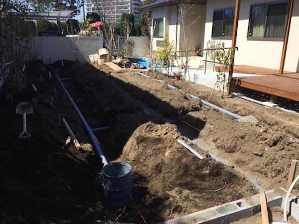 • ・水たまり問題を解消すべく、庭造りの前に暗渠排水工事からスタート