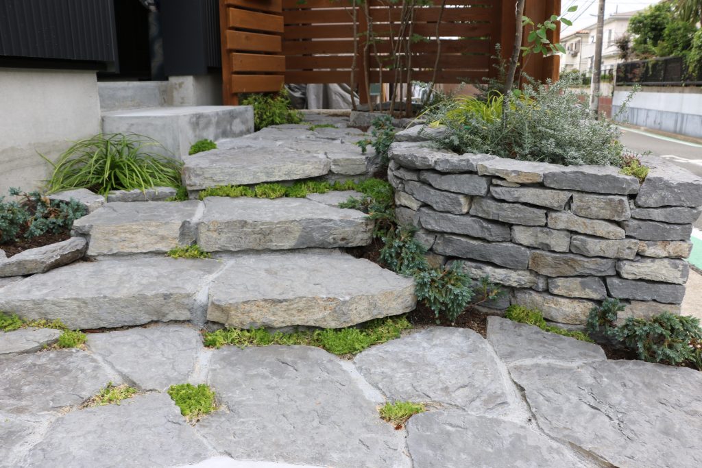 - 玄関アプローチは、ベスの黒のファントムマスク (ガルバ)にあわせて、ブルーグレイのかっこいいカナディアン・グレイ・バサルト・クレイジーのロックガーデン風に仕上げました