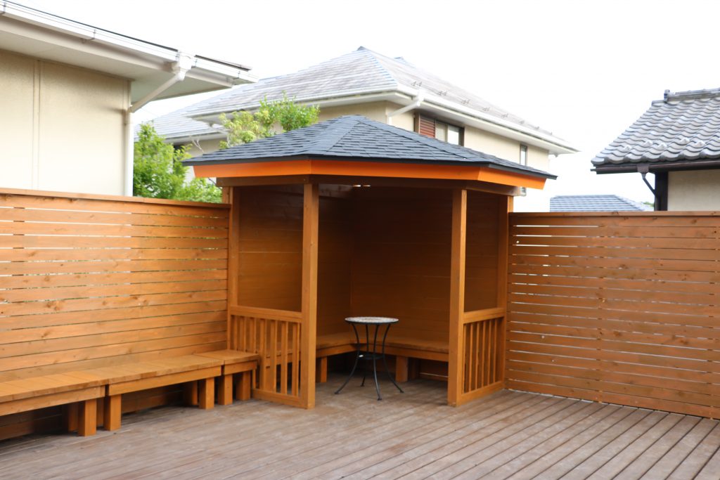 - デッキを広くつくり、寝巻きで出ても大丈夫なように目隠しウッドボードを作成